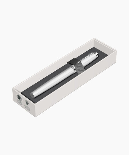 - Penita din aur masiv de 18K placata integral cu rodiu, avand in varf pastila de iridiu. Stiloul functioneaza atat cu cartuse, cat si cu convertor