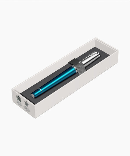 Stilou Personalizabil Parker Vibrant Rings Marine BlueRead more- Accesorii din alama placate cu aliaj black trim si inele placate prin tehnologie PVD cu aliaj blue metal. Clip din otel placat cu aliaj black trim