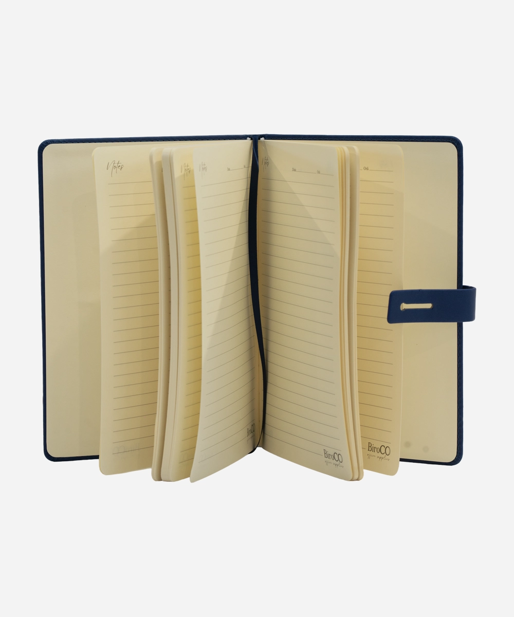 Agenda nedatată Biroco, format A5 (14,5×21 cm), are 96 de file din hârtie ivory de 80 g/mp, imprimate cu liniatură fină. Coperta este din piele ecologică (PU) pe carton rigid de 1,5 mm și este prevăzută cu închidere cu buton metalic. Include forzaț din hârtie de 120 g/mp. Culoare copertă: albastru. Ambalare: 40 bucăți/cutie.
