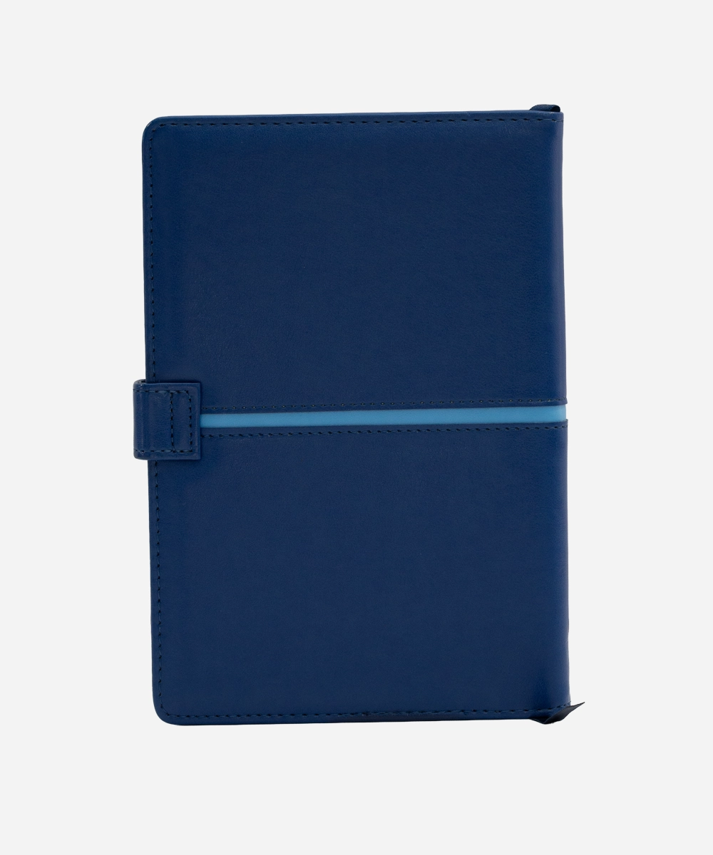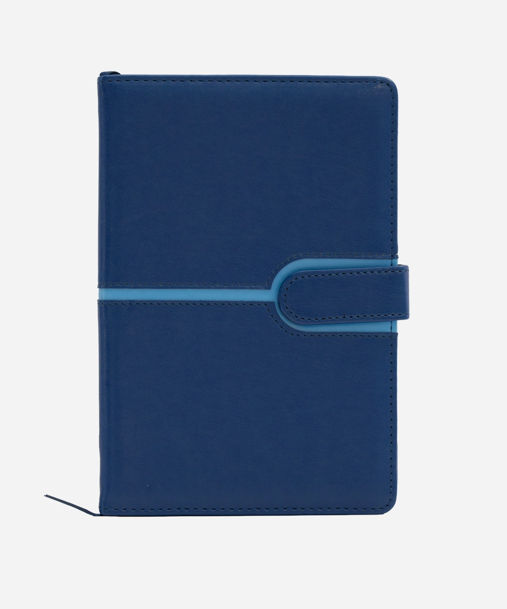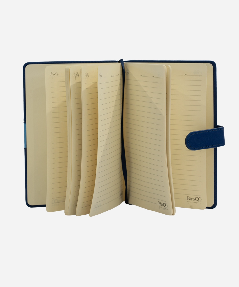 Agenda nedatată Biroco, format A5 (14,5×21 cm), are 96 de file din hârtie ivory de 80 g/mp, imprimată cu linii fine. Coperta este realizată din piele ecologică (PU) pe carton rigid de 1,5 mm, cu burete și sistem de închidere magnetică. Include forzaț din hârtie albă de 120 g / mp. Culoare copertă: albastru. Ambalare: 40 bucăți/cutie.